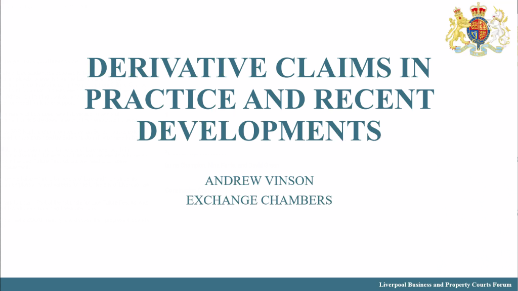 Our second speaker was Andrew Vinson, a barrister at Exchange Chambers. Andrew followed the Judge’s talk with a thorough examination of derivative actions for the second half of the session. Andrew introduced the area of derivative actions and provided some fascinating insights into derivative actions. Andrew discussed, inter alia, Foss v. Harbottle, claimant standing, the statutory regime, recent case law, starting a claim, good faith, and, alternative remedies. Andrew then went on to discuss the common law position. A recording of Andrew Vinson’s talk can be seen here.